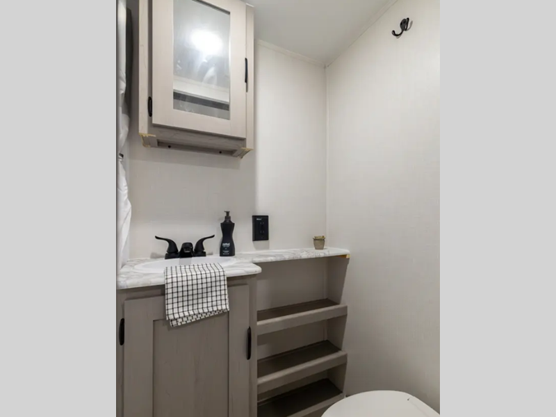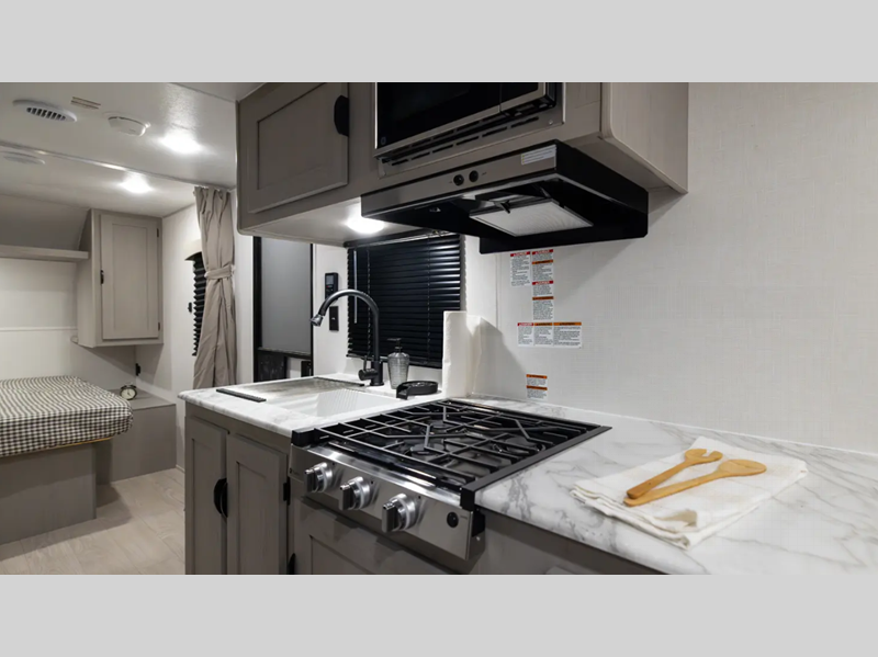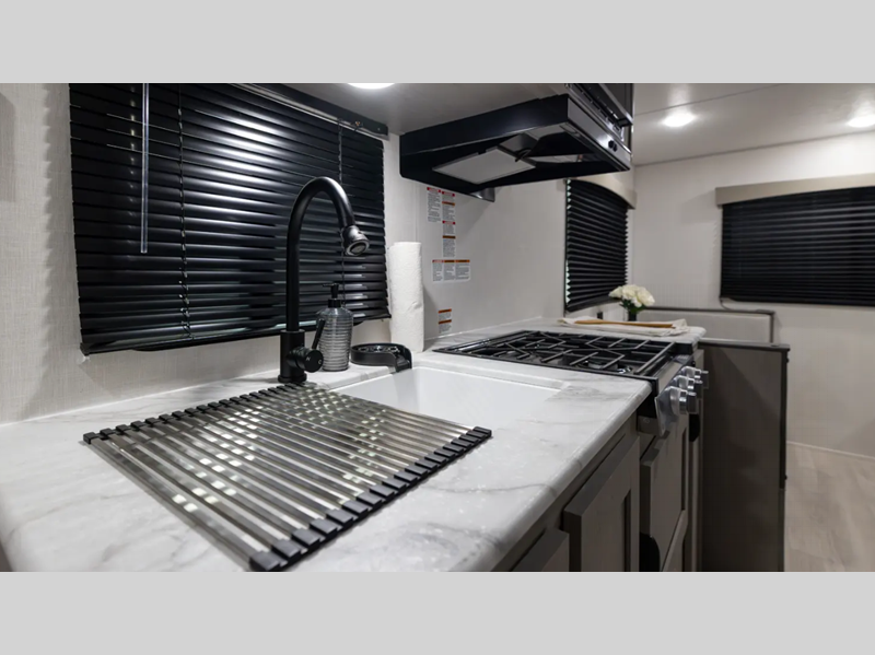 Sleeps 4 Length 26 ft 10 in Ext Width 8 ft Hitch Weight 700 lbs GVWR 7700 lbs Dry Weight 4724 lbs Cargo Capacity 2976 lbs Fresh Water Capacity 40 gals Grey Water Capacity 32 gals Black Water Capacity 32 gals Furnace BTU 20000 btu Available Beds Queen Refrigerator Type GE 12V Refrigerator Size 10 cu ft Cooktop Burners 3 Shower Size 24 x 36 Number of Awnings 1 Water Heater Type Tankless on demand AC BTU 13500 btu Awning Info 18' Power Awning w/ LED Strip and Adjustable Legs Axle Count 2 Shower Type Standard Similar Floorplans