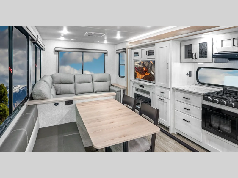 Sleeps 7 Slides 1 Length 33 ft 9 in Ext Width 8 ft Ext Height 11 ft 2 in Hitch Weight 880 lbs GVWR 9680 lbs Dry Weight 7628 lbs Cargo Capacity 2052 lbs Fresh Water Capacity 53 gals Grey Water Capacity 60 gals Black Water Capacity 30 gals Furnace BTU 35000 btu Number Of Bunks 2 Available Beds Queen Refrigerator Type 12V Residential Inspired Cooktop Burners 2 Number of Awnings 1 Water Heater Type On Demand Tankless AC BTU 15000 btu TV Info LED Smart TV Awning Info 21' Power Axle Count 2 Shower Type Standard Similar Floorplans