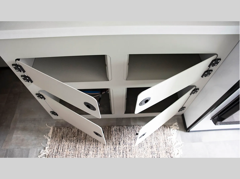 The one-piece Luxe vinyl flooring and aluminum cabinetry will be easy to clean, and there are sleek solid surface countertops. You will also find Tweed interior walls with Azdel, USB charging ports to keep your phone charged, plus an on-demand water heater for added comfort!