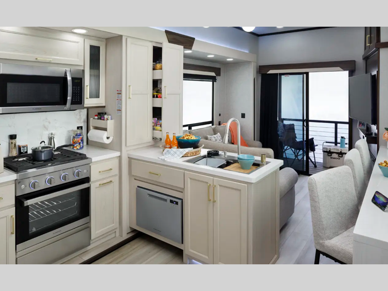 - Under Island Pullout Caddy & Baking Tray Storage (Travel Trailer Only)