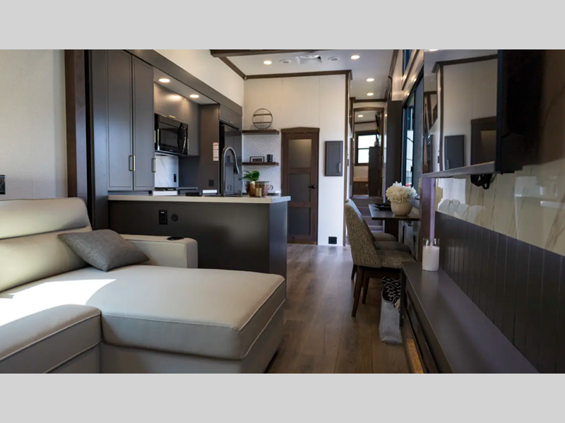Sleeps 4 Slides 3 Length 42 ft 5 in Ext Width 8 ft 6 in Ext Height 13 ft 5 in Hitch Weight 1345 lbs GVWR 13345 lbs Dry Weight 12004 lbs Cargo Capacity 1341 lbs Fresh Water Capacity 75 gals Grey Water Capacity 82 gals Black Water Capacity 41 gals Available Beds King Refrigerator Type 12V Glass Front with Icemaker Refrigerator Size 18 cu ft Cooktop Burners 3 Number of Awnings 1 Water Heater Capacity 20 gal Water Heater Type Electric AC BTU 30000 btu TV Info LR 50" Smart TV, BR 32" TV Awning Info 18' Electric w/LED Night Lighting Strip Axle Count 2 Shower Type Shower w/Seat Electrical Service 50 amp Similar Floorplans