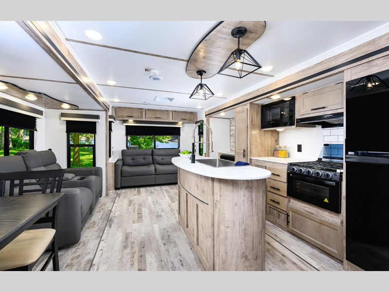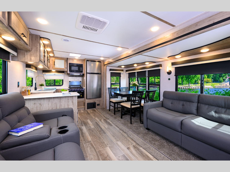 Sleeps 5 Slides 2 Length 33 ft 7 in Ext Width 8 ft Ext Height 11 ft 5 in Int Height 6 ft 8 in Hitch Weight 940 lbs Dry Weight 7390 lbs Cargo Capacity 2350 lbs Fresh Water Capacity 23 gals Grey Water Capacity 33 gals Black Water Capacity 33 gals Furnace BTU 35000 btu Available Beds Queen Refrigerator Type 12V Refrigerator Size 10.7 cu ft Cooktop Burners 3 Number of Awnings 1 LP Tank Capacity 20 lbs Water Heater Type Tankless AC BTU 13500 btu Awning Info Electric with LED Lights Axle Count 2 Number of LP Tanks 2 Shower Type Standard Electrical Service 30 amp Similar Floorplans