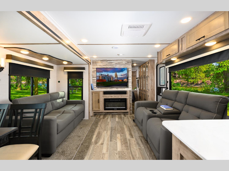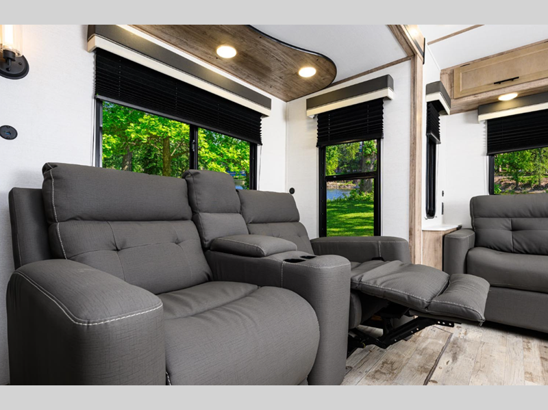 Sleeps 5 Slides 2 Length 38 ft 4 in Ext Width 8 ft Ext Height 11 ft 3 in Int Height 6 ft 8 in Hitch Weight 1160 lbs Dry Weight 8480 lbs Cargo Capacity 1880 lbs Fresh Water Capacity 36 gals Grey Water Capacity 110 gals Black Water Capacity 37 gals Furnace BTU 30000 btu Available Beds King Refrigerator Type 12V Refrigerator Size 10.7 cu ft Cooktop Burners 3 Number of Awnings 1 LP Tank Capacity 20 lbs Water Heater Type Tankless AC BTU 13500 btu Awning Info Electric with LED Lights Axle Count 2 Number of LP Tanks 2 Shower Type Radius Electrical Service 30 amp Similar Floorplans