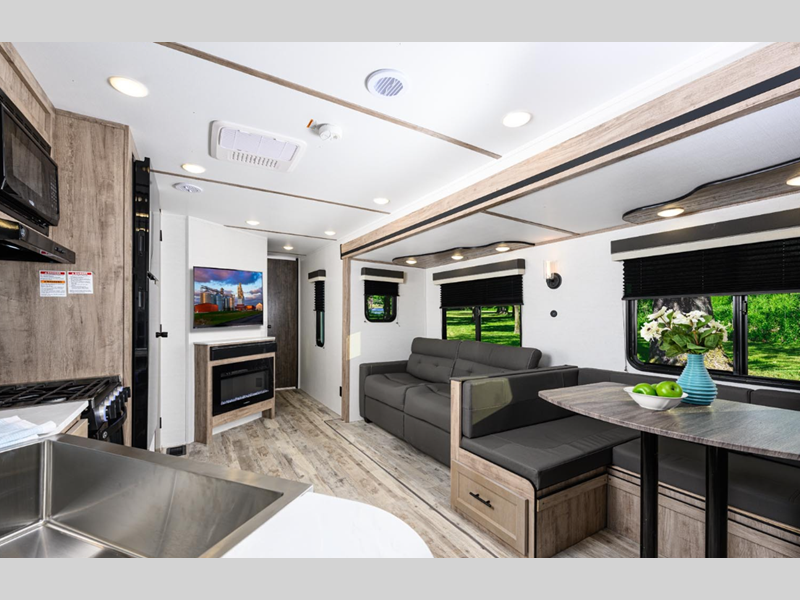 Sleeps 4 Slides 1 Length 30 ft 5 in Ext Width 8 ft Ext Height 11 ft 3 in Int Height 6 ft 8 in Hitch Weight 650 lbs Dry Weight 6290 lbs Cargo Capacity 3160 lbs Fresh Water Capacity 35 gals Grey Water Capacity 67 gals Black Water Capacity 33 gals Furnace BTU 25000 btu Available Beds Queen Refrigerator Type 12V Refrigerator Size 10.7 cu ft Cooktop Burners 3 Number of Awnings 1 LP Tank Capacity 20 lbs Water Heater Type Tankless AC BTU 13500 btu Awning Info Electric with LED Lights Axle Count 2 Number of LP Tanks 2 Shower Type Radius Electrical Service 30 amp Similar Floorplans