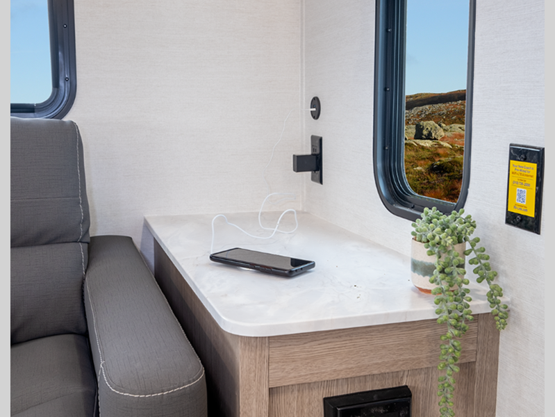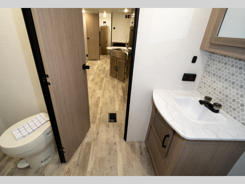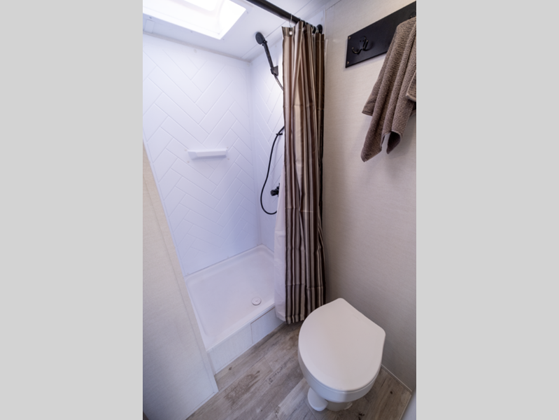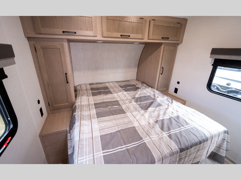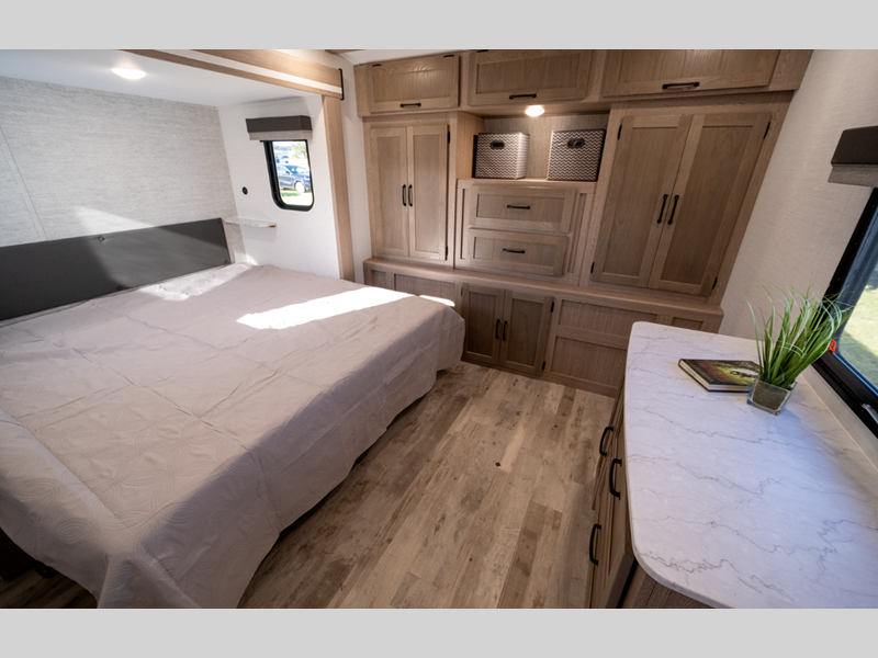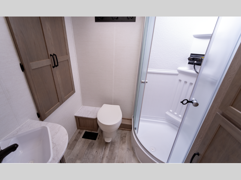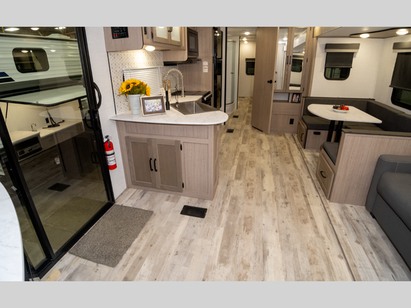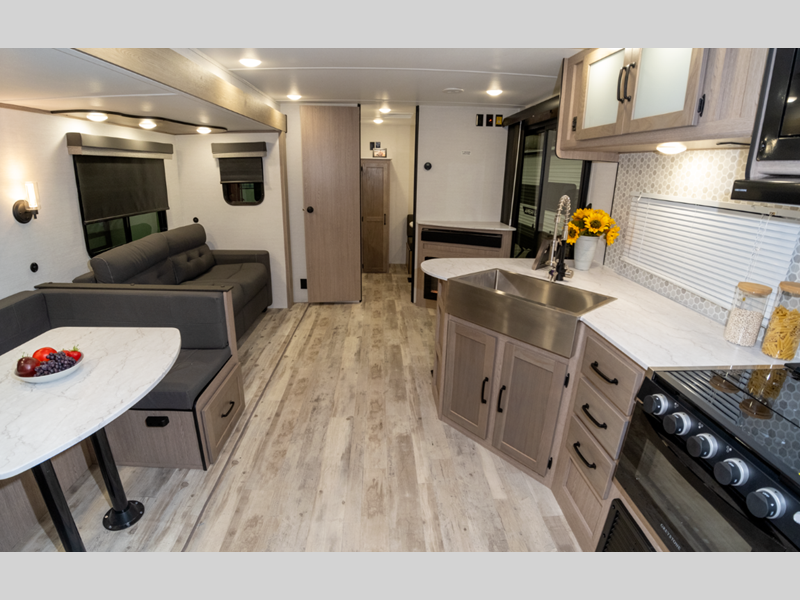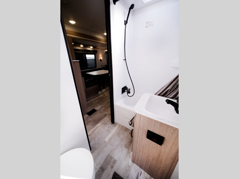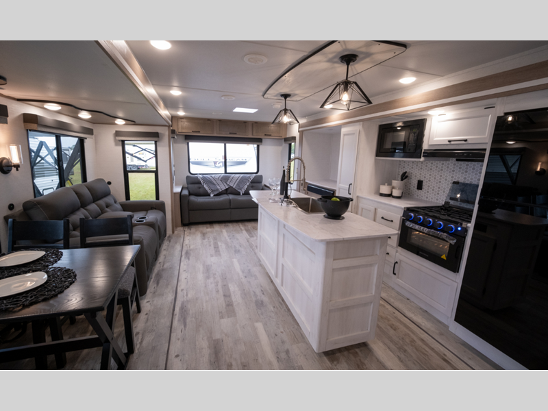 Inside each model you'll enjoy larger slide windows for beautiful outdoor views, hi-performance wood grain vinyl flooring, plus extensive storage throughout for all your belongings. The handcrafted cabinetry is sure to make you feel right at home, and the chef of your group will love the full kitchen to cook their best meals in. The Supreme Package comes standard on each model and includes an electric awning with LED lights, an outside shower, a tankless water heater, and more!