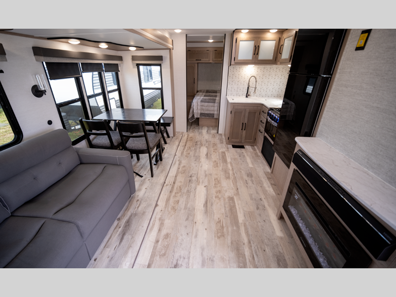 Sleeps 4 Slides 2 Length 33 ft 7 in Ext Width 8 ft Ext Height 11 ft 5 in Int Height 6 ft 8 in Hitch Weight 940 lbs Dry Weight 7390 lbs Cargo Capacity 2350 lbs Fresh Water Capacity 23 gals Grey Water Capacity 33 gals Black Water Capacity 33 gals Furnace BTU 35000 btu Available Beds Queen Refrigerator Type 12V Refrigerator Size 10.7 cu ft Cooktop Burners 3 Number of Awnings 1 LP Tank Capacity 20 lbs Water Heater Type Tankless AC BTU 13500 btu Awning Info Electric with LED Lights Axle Count 2 Number of LP Tanks 2 Shower Type Standard Electrical Service 30 amp Similar Floorplans