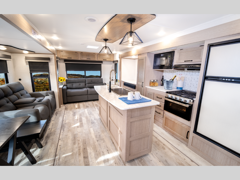 Sleeps 5 Slides 3 Length 37 ft 7 in Ext Width 8 ft Ext Height 11 ft 5 in Int Height 6 ft 8 in Hitch Weight 1530 lbs Dry Weight 9190 lbs Cargo Capacity 1540 lbs Fresh Water Capacity 35 gals Grey Water Capacity 33 gals Black Water Capacity 34 gals Furnace BTU 35000 btu Available Beds King Refrigerator Type 12V Refrigerator Size 10.7 cu ft Cooktop Burners 3 Number of Awnings 1 LP Tank Capacity 20 lbs Water Heater Type Tankless AC BTU 13500 btu Awning Info Electric w/LED Lights Axle Count 2 Number of LP Tanks 2 Shower Type Standard Electrical Service 30 amp Similar Floorplans