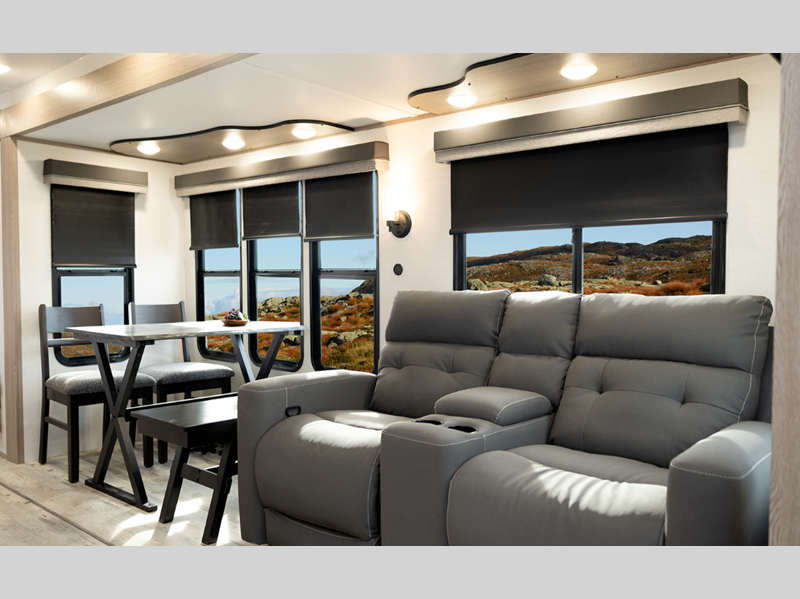 Sleeps 4 Slides 2 Length 38 ft 4 in Ext Width 8 ft Ext Height 11 ft 3 in Int Height 6 ft 8 in Hitch Weight 1160 lbs Dry Weight 8480 lbs Cargo Capacity 1880 lbs Fresh Water Capacity 36 gals Grey Water Capacity 110 gals Black Water Capacity 37 gals Furnace BTU 35000 btu Available Beds King Refrigerator Type 12V Refrigerator Size 10.7 cu ft Cooktop Burners 3 Number of Awnings 1 LP Tank Capacity 20 lbs Water Heater Type Tankless AC BTU 13500 btu Awning Info Electric with LED Lights Axle Count 2 Number of LP Tanks 2 Shower Type Radius Electrical Service 30 amp Similar Floorplans