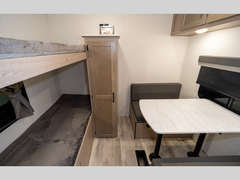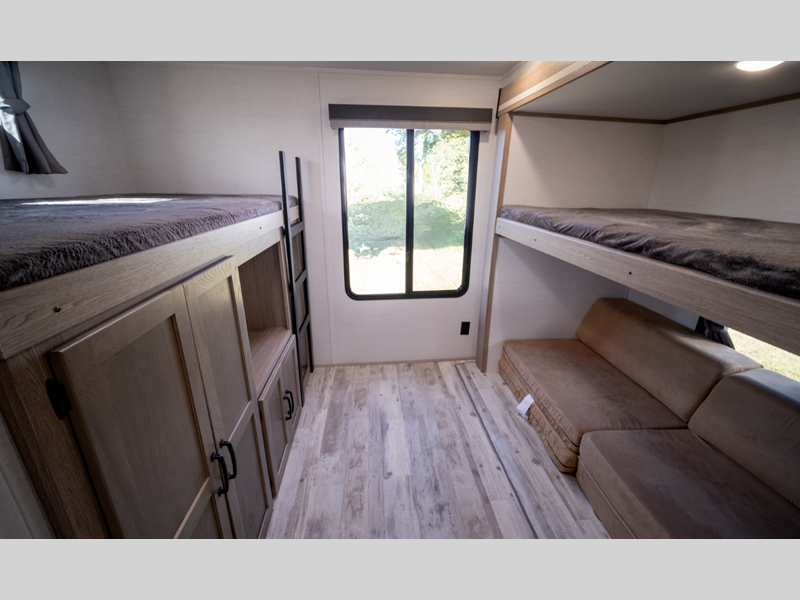 Sleeps 9 Slides 2 Length 33 ft Ext Width 8 ft Ext Height 10 ft 9 in Int Height 6 ft 8 in Hitch Weight 910 lbs Dry Weight 6660 lbs Cargo Capacity 1820 lbs Fresh Water Capacity 35 gals Grey Water Capacity 67 gals Black Water Capacity 33 gals Furnace BTU 30000 btu Number Of Bunks 2 Available Beds Queen Refrigerator Type 12V Refrigerator Size 10.7 cu ft Cooktop Burners 3 Number of Awnings 1 LP Tank Capacity 20 lbs Water Heater Type Tankless AC BTU 13500 btu Awning Info Electric with LED Lights Axle Count 2 Number of LP Tanks 2 Shower Type Tub/Shower Combo Electrical Service 30 amp Similar Floorplans