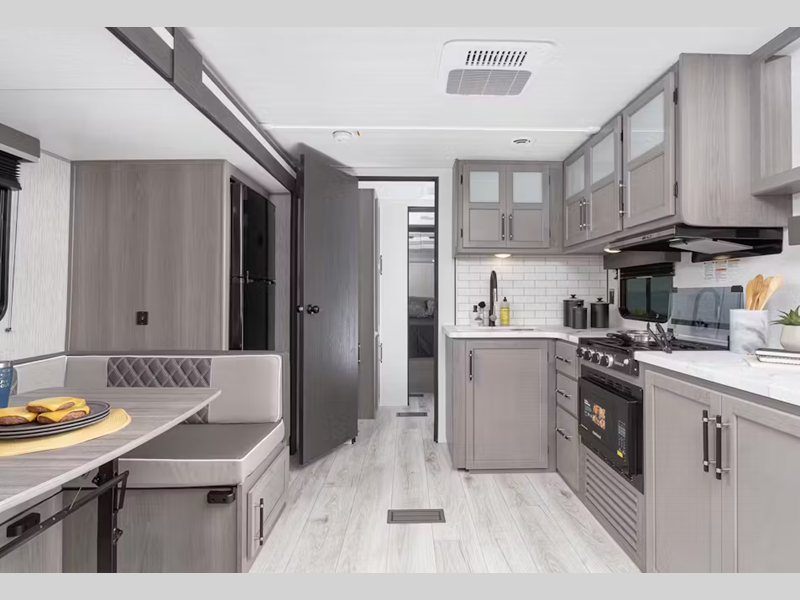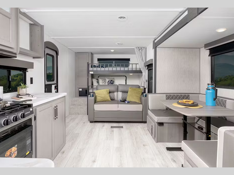 Inside, you'll enjoy blackout night shades, LED lighting, a stainless-steel sink, and pressed membrane premium countertops. The tankless water heater will provide endless hot showers and the 30k BTU furnace will help keep you warm on chilly evenings. Each model is also SolarFlex ready for off-grid capabilities, and there is Furrion backup camera prep for the option to make parking smoother.