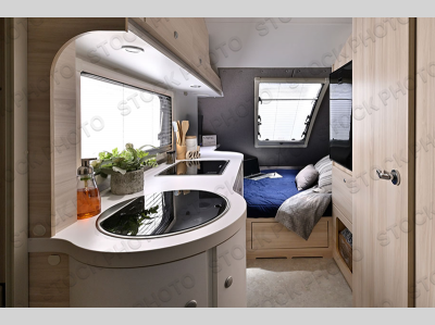 The TAB 400 is built with the unique teardrop design on a single axle, and includes composite flooring, molded underbelly shield, and a rear stargazer window allowing you to stargaze at night. There is a 310-watt solar panel included allowing you to camp off-grid, and the Alde central heating/hot water system plus the central air conditioning will keep you comfortable whichever season you camp. You will also love the interior that offers a spacious wet bath, dual sleeping areas, and kitchen amenities. The Boondock package comes standard, but you can also choose the optional Black Canyon Upgrade with an additional solar panel, holding tank heaters, underglow lights, and an XL diamond plate storage tub!