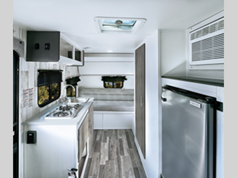 Sleeps 4 Length 16 ft 6 in Ext Width 7 ft 11 in Ext Height 8 ft 1 in Hitch Weight 248 lbs GVWR 2500 lbs Dry Weight 2084 lbs Cargo Capacity 396 lbs Fresh Water Capacity 10 gals Grey Water Capacity 30 gals Black Water Capacity 15 gals Tire Size 175/80R13 Furnace BTU 18000 btu Number Of Bunks 1 Refrigerator Type 12V Refrigerator Size 3 cu ft Cooktop Burners 2 Number of Awnings 1 Axle Weight 2500 lbs Water Heater Type On Demand Tankless AC BTU 6000 btu Axle Count 1 Shower Type Wet/Bath Shower Electrical Service 30 amp Similar Floorplans