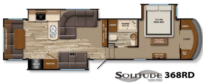 This Grand Design Solitude will have you traveling in style to any place you dream to go. You will love the spaciousness of 368RD with triple slides. It also features an optional cozy fireplace, king size bed, and large u-shaped dinette for mealtime.
